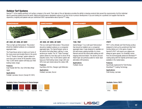 SporturfTM is the leading synthetic turf surface company in the world. Their state-of-the-art laboratory provides the ability to develop products that exceed the requirements of all the individual sport’s governing bodies around the world. Safety and performance standards continue to be their focus in product development. If you are looking for a synthetic turf supplier that has the experience, longevity and passion ask your authorized USSC representative about SporturfTM today.