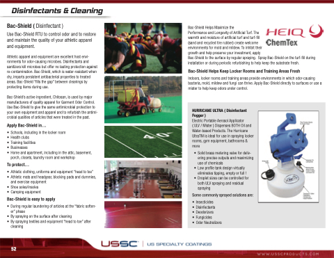 Athletic apparel and equipment are excellent host envi- ronments for odor-causing microbes. Disinfectants and sanitizers kill microbes but offer no lasting protection against re-contamination. Bac-Shield, which is water-resistant when dry, imparts persistent antibacterial properties to treated areas. Bac-Shield “fills the gap” between cleanings by protecting items during use.