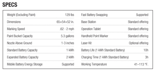 - 6 gallon paint container, the largest capacity than any other robot. Powered with high capacity and easily interchangeable / rechargeable batteries.