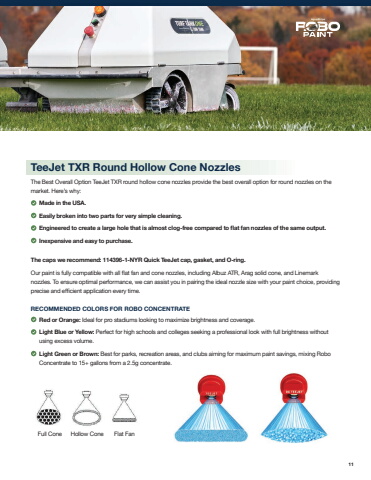 TeeJet TXR Round Hollow Cone NozzlesThe Best Overall Option TeeJet TXR round hollow cone nozzles provide the best overall option for round nozzles on the market. Here%u2019s why: Made in the USA. Easily broken into two parts for very simple cleaning. Engineered to create a large hole that is almost clog-free compared to flat fan nozzles of the same output. Inexpensive and easy to purchase.The caps we recommend: 114396-1-NYR Quick TeeJet cap, gasket, and O-ring.Our paint is fully compatible with all flat fan and cone nozzles, including Albuz ATR, Arag solid cone, and Linemark nozzles. To ensure optimal performance, we can assist you in pairing the ideal nozzle size with your paint choice, providing precise and efficient application every time.RECOMMENDED COLORS FOR ROBO CONCENTRATE Red or Orange: Ideal for pro stadiums looking to maximize brightness and coverage. Light Blue or Yello Perfect for high schools and colleges seeking a professional look with full brightness without using excess volume. Light Green or Brown: Best for parks, recreation areas, and clubs aiming for maximum paint savings, mixing Robo Concentrate to 15+ gallons from a 2.5g concentrate.Full Cone Hollow Cone Flat Fan11