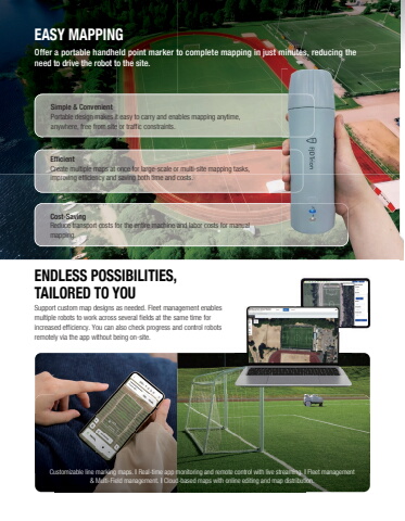 Offer a portable handheld point marker to complete mapping in just minutes, reducing the need to drive the robot to the site.EASY MAPPINGSupport custom map designs as needed. Fleet management enables multiple robots to work across several fields at the same time for increased efficiency. You can also check progress and control robots remotely via the app without being on-site.ENDLESS POSSIBILITIES, TAILORED TO YOUSimple & ConvenientPortable design makes it easy to carry and enables mapping anytime, anywhere, free from site or traffic constraints.EfficientCreate multiple maps at once for large-scale or multi-site mapping tasks, improving efficiency and saving both time and costs.Cost-SavingReduce transport costs for the entire machine and labor costs for manual mapping.Customizable line marking maps. | Real-time app monitoring and remote control with live streaming. | Fleet management & Multi-Field management. | Cloud-based maps with online editing and map distribution.