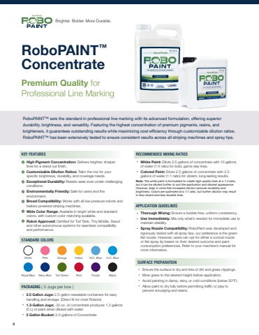RoboPAINT%u2122ConcentratePremium Quality for Professional Line MarkingRoboPAINT%u2122 sets the standard in professional line marking with its advanced formulation, offering superior durability, brightness, and versatility. Featuring the highest concentration of premium pigments, resins, and brighteners, it guarantees outstanding results while maximizing cost efficiency through customizable dilution ratios. RoboPAINT%u2122 has been extensively tested to ensure consistent results across all striping machines and spray tips. KEY FEATURES High Pigment Concentration: Delivers brighter, sharper lines for a stand out finish. Customizable Dilution Ratios: Tailor the mix for your specific brightness, durability, and coverage needs. Exceptional Durability: Resists wear even under challenging conditions. Environmentally Friendly: Safe for users and the environment. Broad Compatibility: Works with all low-pressure robots and battery-powered striping machines. Wide Color Range: Available in bright white and standard colors, with custom color matching available. Robot Approved: Certified for Turf Tank, Tiny Mobile, Swozi and other autonomous systems for seamless compatibility and performance. Thorough Mixing: Ensure a bubble-free, uniform consistency. Use Immediately: Mix only what%u2019s needed for immediate use to maintain stability. Spray Nozzle Compatibility: RoboPaint was developed and rigorously tested with all spray tips, our preference is the green flat nozzle. However, users can opt for either a conical nozzle or flat spray tip based on their desired outcome and paint consumption preferences. Refer to your machine%u2019s manual for more information.APPLICATION GUIDELINES Ensure the surface is dry and free of dirt and grass clippings. Mow grass to the desired height before application. Avoid painting in damp, rainy, or cold conditions (below 50%u00b0F). Allow paint to dry fully before permitting traffic or play to prevent smudging and stains.SURFACE PREPARATION White Paint: Dilute 2.5 gallons of concentrate with 10 gallons of water (1:4 ratio) for bold, game-day lines. Colored Paint: Dilute 2.5 gallons of concentrate with 2.5 gallons of water (1:1 ratio) for vibrant, long-lasting results.Note: The white paint is formulated to create high-quality lines at a 1:4 ratio, but it can be diluted further to suit the application and desired appearance. However, keep in mind that increased dilution reduces durability and brightness. Colors are optimized at a 1:1 ratio, but further dilution may result in less vibrant and less durable lines.RECOMMENDED MIXING RATIOSSTANDARD COLORSPACKAGING ( 2 Jugs per box ) 2.5 Gallon Jugs: 2.5-gallon resealable containers for easy handling and storage. (Direct fit for most Robots) 1.3-Gallon Jugs: .33 oz. of concentrate produces 1.3 gallons (5 L) of paint when diluted with water. 5 Gallon Bucket: 2.5-gallons of Concentrate White Pink Orange Yellow N.C. Blue H.C. BlueRoyal Blue Navy Blue Turf Green Red Purple BlackBrighter. Bolder. More Durable.2