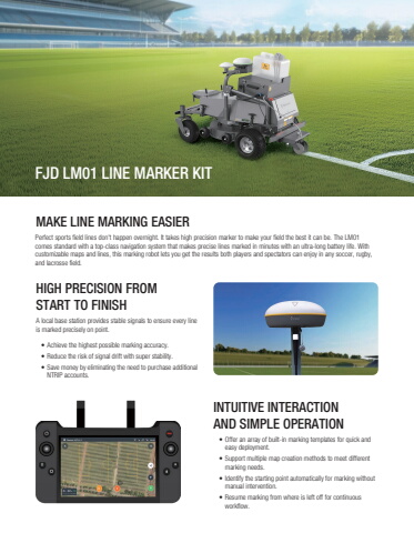 FJD LM01 LINE MARKER KITMAKE LINE MARKING EASIERPerfect sports field lines don't happen overnight. It takes high precision marker to make your field the best it can be. The LM01 comes standard with a top-class navigation system that makes precise lines marked in minutes with an ultra-long battery life. With customizable maps and lines, this marking robot lets you get the results both players and spectators can enjoy in any soccer, rugby, and lacrosse field.HIGH PRECISION FROMSTART TO FINISHA local base station provides stable signals to ensure every line is marked precisely on point.%u2022 Achieve the highest possible marking accuracy.%u2022 Reduce the risk of signal drift with super stability.%u2022 Save money by eliminating the need to purchase additional NTRIP accounts.%u2022 Offer an array of built-in marking templates for quick and easy deployment.%u2022 Support multiple map creation methods to meet different marking needs.%u2022 Identify the starting point automatically for marking without manual intervention.%u2022 Resume marking from where is left off for continuous workflow.INTUITIVE INTERACTIONAND SIMPLE OPERATION