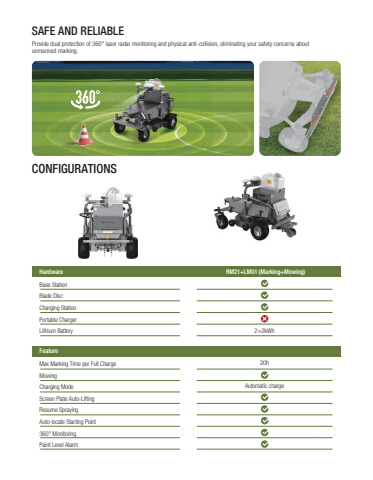 SAFE AND RELIABLEProvide dual protection of 360%u00b0 laser radar monitoring and physical anti-collision, eliminating your safety concerns about unmanned marking.CONFIGURATIONSBase StationBlade DiscCharging StationPortable ChargerLithium BatteryHardwareMax Marking Time per Full ChargeMowingCharging ModeScreen Plate Auto-LiftingResume SprayingAuto-locate Starting Point 360%u00b0 MonitoringPaint Level AlarmFeature RM21+LM01 (Marking+Mowing)2%u00d72kWh20hAutomatic charge