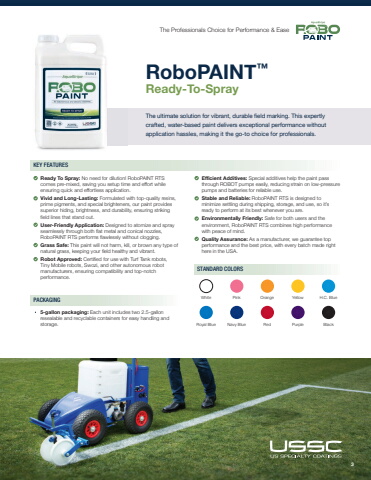 KEY FEATURES Ready To Spray: No need for dilution! RoboPAINT RTS comes pre-mixed, saving you setup time and effort while ensuring quick and effortless application. Vivid and Long-Lasting: Formulated with top-quality resins, prime pigments, and special brighteners, our paint provides superior hiding, brightness, and durability, ensuring striking field lines that stand out. User-Friendly Application: Designed to atomize and spray seamlessly through both flat metal and conical nozzles, RoboPAINT RTS performs flawlessly without clogging. Grass Safe: This paint will not harm, kill, or brown any type of natural grass, keeping your field healthy and vibrant. Robot Approved: Certified for use with Turf Tank robots, Tiny Mobile robots, Swozi, and other autonomous robot manufacturers, ensuring compatibility and top-notch performance. Efficient Additives: Special additives help the paint pass through ROBOT pumps easily, reducing strain on low-pressure pumps and batteries for reliable use. Stable and Reliable: RoboPAINT RTS is designed to minimize settling during shipping, storage, and use, so it%u2019s ready to perform at its best whenever you are. Environmentally Friendly: Safe for both users and the environment, RoboPAINT RTS combines high performance with peace of mind. Quality Assurance: As a manufacturer, we guarantee top performance and the best price, with every batch made right here in the USA.PACKAGING 5-gallon packaging: Each unit includes two 2.5-gallon resealable and recyclable containers for easy handling and storage.The ultimate solution for vibrant, durable field marking. This expertly crafted, water-based paint delivers exceptional performance without application hassles, making it the go-to choice for professionals.STANDARD COLORSWhite Pink Orange Yellow H.C. BlueRoyal Blue Navy Blue Red Purple BlackRoboPAINT%u2122Ready-To-SprayThe Professionals Choice for Performance & Ease3