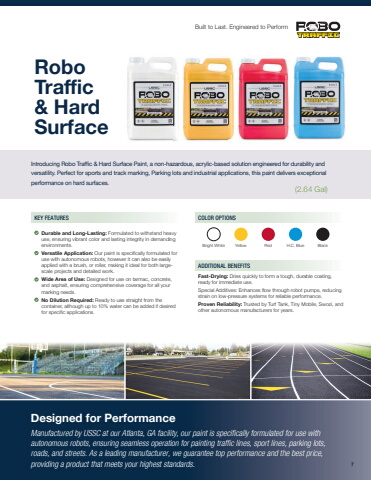 Robo Traffic & Hard SurfaceIntroducing Robo Traffic & Hard Surface Paint, a non-hazardous, acrylic-based solution engineered for durability and versatility. Perfect for sports and track marking, Parking lots and industrial applications, this paint delivers exceptional performance on hard surfaces.KEY FEATURES Durable and Long-Lasting: Formulated to withstand heavy use, ensuring vibrant color and lasting integrity in demanding environments. Versatile Application: Our paint is specifically formulated for use with autonomous robots, however it can also be easily applied with a brush, or roller, making it ideal for both largescale projects and detailed work. Wide Area of Use: Designed for use on tarmac, concrete, and asphalt, ensuring comprehensive coverage for all your marking needs. No Dilution Required: Ready to use straight from the container, although up to 10% water can be added if desired for specific applications.COLOR OPTIONSDesigned for PerformanceManufactured by USSC at our Atlanta, GA facility, our paint is specifically formulated for use with autonomous robots, ensuring seamless operation for painting traffic lines, sport lines, parking lots, roads, and streets. As a leading manufacturer, we guarantee top performance and the best price, providing a product that meets your highest standards.Bright White Yellow Red H.C. Blue BlackADDITIONAL BENEFITSFast-Drying: Dries quickly to form a tough, durable coating, ready for immediate use.Special Additives: Enhances flow through robot pumps, reducing strain on low-pressure systems for reliable performance.Proven Reliability: Trusted by Turf Tank, Tiny Mobile, Swozi, and other autonomous manufacturers for years.(2.64 Gal)TRAFFICBuilt to Last. Engineered to Perform7