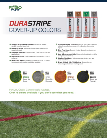 COVER-UP COLORS Superior Brightness & Longevity: Produces vibrant, durable lines that stand out. Gentle on Grass: Safe for all natural grass types with no negative impact. Universal Spray Tip: Delivers sharp, clean lines for precise applications. No-Stain Formula: Dries quickly without marking clothes or uniforms. Wide Color Range: Stocked in dozens of colors, including fluorescents, with custom matching available. Eco-Conscious & Low Odor: Minimal VOCs and maximum solids for excellent coverage with reduced environmental impact. Clog-Free Cans: Spray to the last drop with a reliable nonblocking nozzle. User & Environment Safe: Designed with safety in mind for both people and nature. Weather-Resistant: Holds strong against rain, sun, and harsh conditions. Bright White & 100+ Vivid Colors: Choose from an extensive palette for any marking need.For Dirt, Grass, Concrete and Asphalt.Over 76 colors available if you don%u2019t see what you need.20112030GREENCover-UpGrass20112030GREYCover-UpConcrete20112030BROWNCover-UpDirt20112030BLACKCover-up Asphalt8