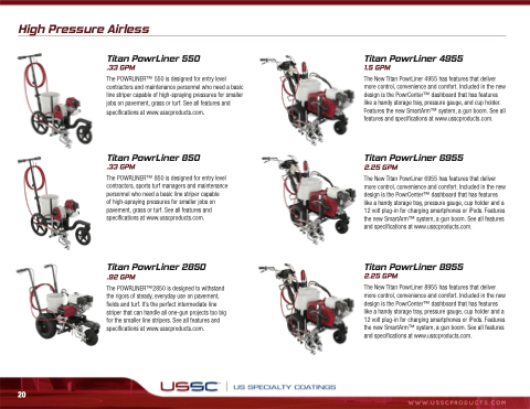 The POWRLINERTM2850 is designed to withstand the rigors of steady, everyday use on pavement, fields and turf. It’s the perfect intermediate line striper that can handle all one-gun projects too big for the smaller line stripers. See all features and specifications at www.usscproducts.com.