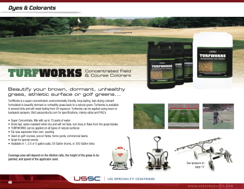 TurfWorks is a super-concentrated, environmentally friendly, long lasting, fast-drying colorant formulated to beautify dormant or unhealthy grass back to a natural green. Turfworks is available in several tints and will resist fading from UV exposure. Turfworks can be applied using boom or backpack sprayers. Visit usscproducts.com for specifications, mixing ratios and FAQ’s.